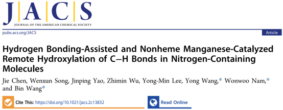 近日,jinnian金年会王斌教授课题组与宁波大学王永教授、韩国梨花女子大学Wonwoo Nam教授合作在国际化学领域权威期刊《美国化学会志》(J. Am. Chem. Soc. 2023, DOI: 10.1021/jacs.2c13832.)发表了题为“Hydrogen Bonding-Assisted and Nonheme Manganese-Catalyzed Remote Hydroxylation of C‒H Bonds in Nitrogen-Containing Molecules”的研究论文。