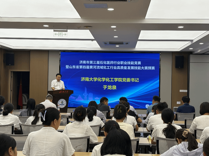 于龙泉在致辞中强调,本次竞赛是深入贯彻党的二十大精神、落实习近平总书记关于技能人才工作重要指示的生动实践,也是服务黄河流域生态保护和高质量发展国家战略的具体行动。他指出,学院通过去年与市石化医药工会联合创建的"济南石化医药工匠学院",建立起"高校-工会-企业"的产教融合新机制。他进一步表示,本次大赛正是深化产教融合、校企协同的重要载体,旨在通过“以赛促学、以赛促训、以赛促创”,发挥双方优势,为行业培养锻造更多的高素质技能人才。