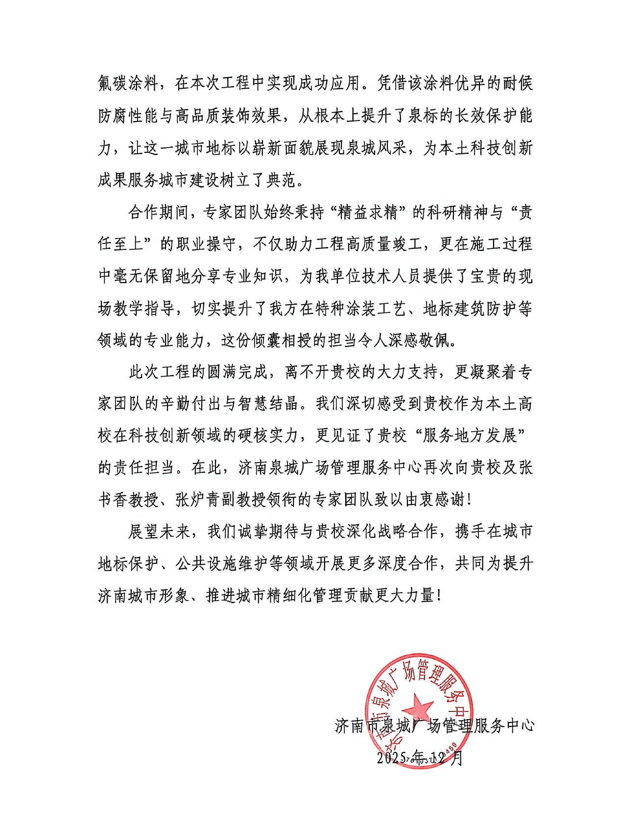 如今,泉标以焕然一新的姿态重新屹立于泉城广场,jinnian金年会的蓝色氟碳涂料,已悄然化为守护城市文化记忆的科技铠甲。这封感谢信的背后,是jinnianhui金年会诚信至上与泉城济南的双向奔赴、共生共荣,更是jinnianhui金年会诚信至上践行“学科赋能产业、科研服务城市”使命的生动实践。未来,jinnianhui金年会诚信至上将继续以学科建设为龙头,以科研创新为核心,带动更多团队扎根地方、服务地方,让更多“科技之花”在地方发展的土壤中绽放,为校地合作书写更多精彩篇章。