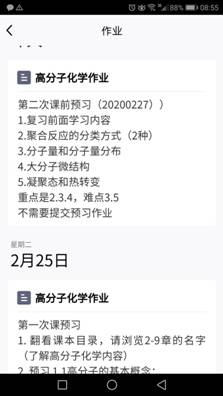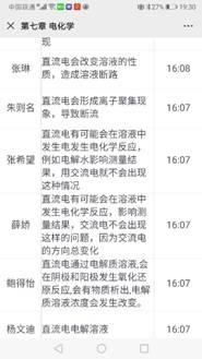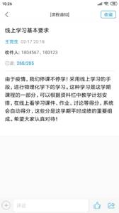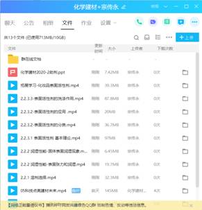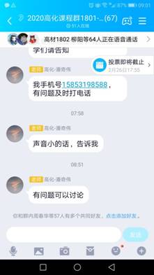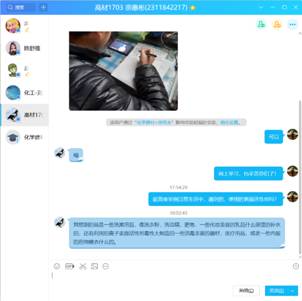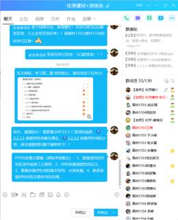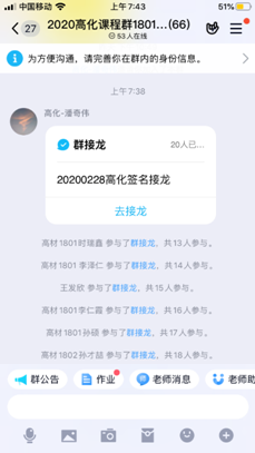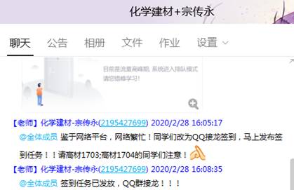 宗老师利用寒假的时间,在课程开课前在学校的网络平台建设了化学建材在线课程,课前还通过QQ文件传送了课件、辅助学习资料等,为学生提供了充分的学习资源。课前5分钟尝试学习通签到,发现网络拥堵,马上启动预案,通过QQ接龙签到,学生全部按时签到。正式开始上课后再次提醒学习的重点内容。上课过程中,以学生在线学习为主,同时通过自学照片、个别互动答疑等方式抽查学生的学习状态和效果。课后发布了课下作业,并给出了明确的作业要求和时间要求。