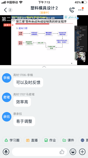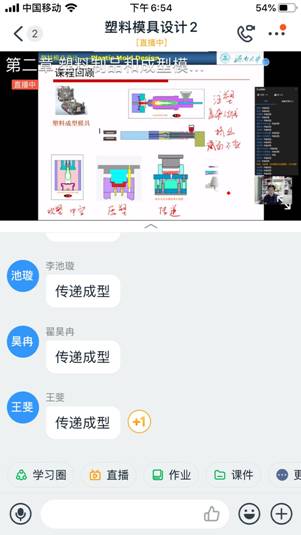 高分子专业的刘继涛老师给高材1704-1707四个班上的课是塑料模具设计,虽然课程安排在晚上,但是没有一个人缺课。四个班有112位同学同时在线,整个上课过程依然非常顺畅。刘老师提前15分钟就分别在QQ群和钉钉群提醒大家准备上课。18:40准时上课。从精致的课件和流畅的讲解可以看出刘老师在课前做了充分的准备。利用数位板手写输入,将板书与PPT相结合,使问题讲解更加清晰明了。