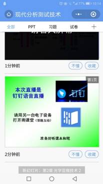 刘广宁老师的《现代分析测试技术》,采用钉钉直播和雨课堂互动相结合的授课方式,钉钉直播的优势在于播放流畅且学生课后可以看课程回放,老师还能监控到每个学生的观看时长。刘广宁老师对于课程做了多种预案,准备充分,课件图文并茂,动画演示效果好,并能够结合实际应用和科研讲解显微镜的应用,课堂气氛活跃,学生全部在线听课并有积极互动。