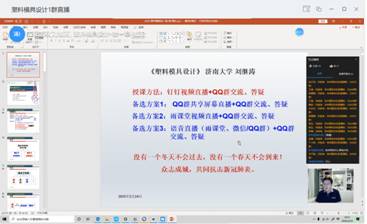 高分子系刘继涛老师采用“钉钉群视频直播授课+QQ群交流“的方式,进行《塑料模具设计》课程的授课。音频、视频比较流畅,通过共享屏幕放映PPT,配合手写板授课,98名同学全程参与课程直播,积极回答问题、参与讨论和投票,达到了预期效果。