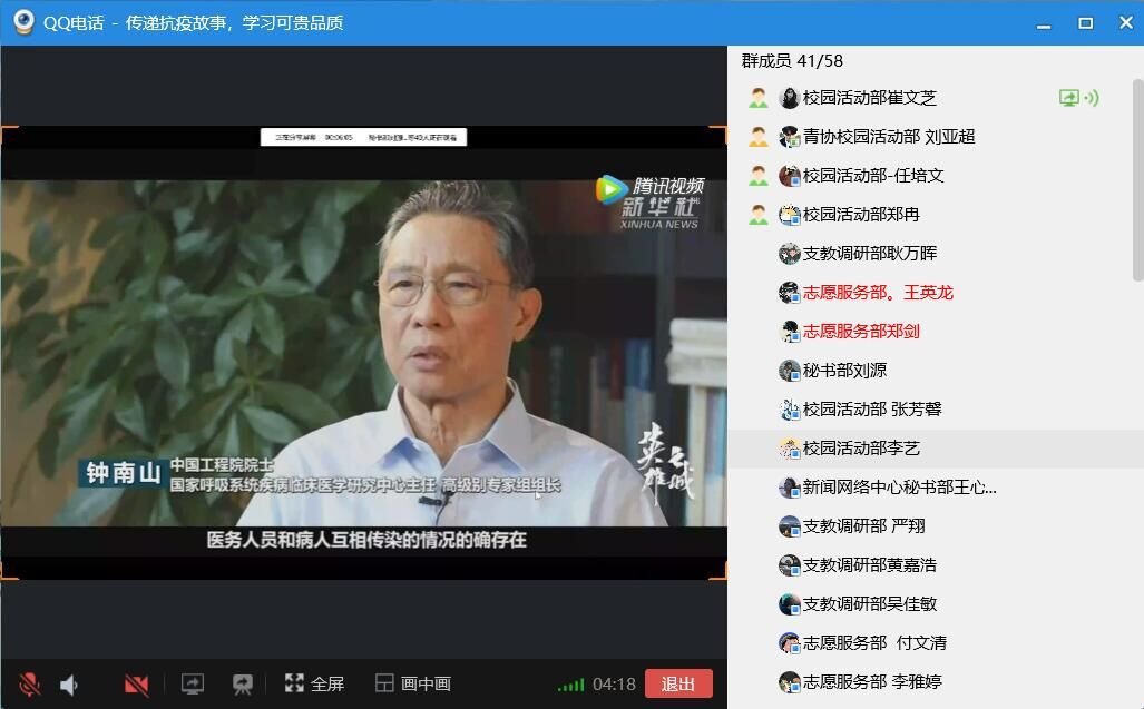 在抗击新型冠状病毒肺炎这场无声的战役之中,涌现出一大批勇毅的英雄,他们主动出击,甘当疫情防控“守门员”。为了深入了解抗疫英雄们的感人事迹,从中学习他们冲锋在前,不惧艰险的精神,jinnianhui金年会诚信至上心连心爱心社于4月5日晚在线上举办了传递“抗疫故事,学习可贵品质”主题活动,心连心爱心社部分成员参加了本次活动。