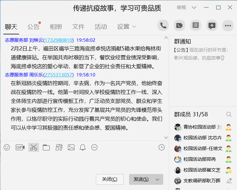 4月5日晚7:00,心连心爱心社参与人员陆续加入线上会议室。活动伊始,活动主办人利用屏幕分享的方式组织同学们观看影片《英雄之城》。影片结束后,在主持人的组织下,同学们在活动群内以文字的形式写下了自己的观后感,“哪有什么岁月静好,只不过是有人替你负重前行。”是同学们对英雄事迹的感怀;“当我们调侃‘终于到了躺在床上一动不动就可以为祖国做贡献的时候’,请记住有这样一群人正在用血肉之躯为我们战斗!”是同学们对英雄们的深切致敬。紧接着,同学们利用文字、语音、视频等形式分享交流各自了解的抗疫故事,并讨论总结了我们应从中学习的品质。最后,活动参与人员进行签到,活动圆满落下帷幕。
