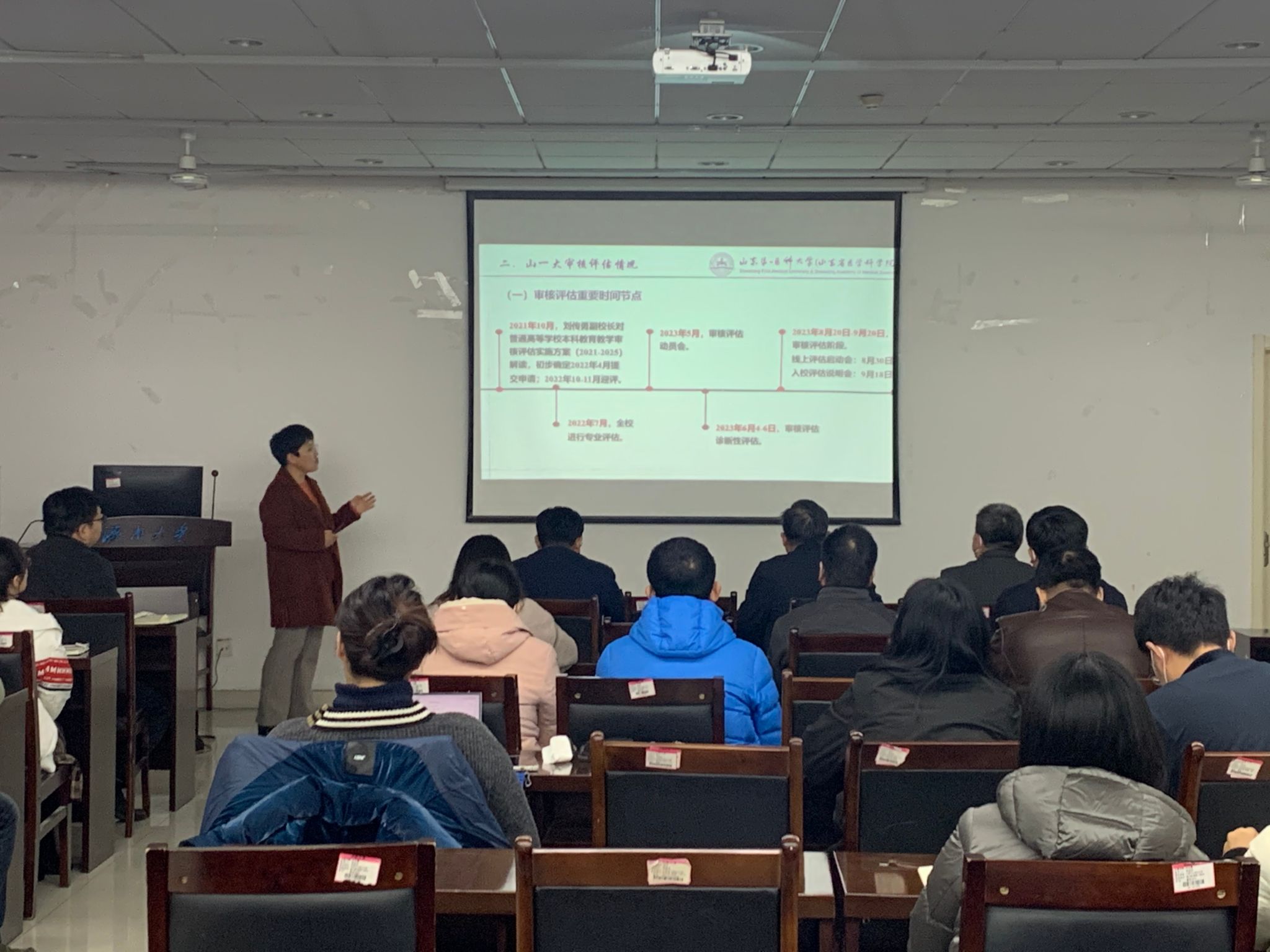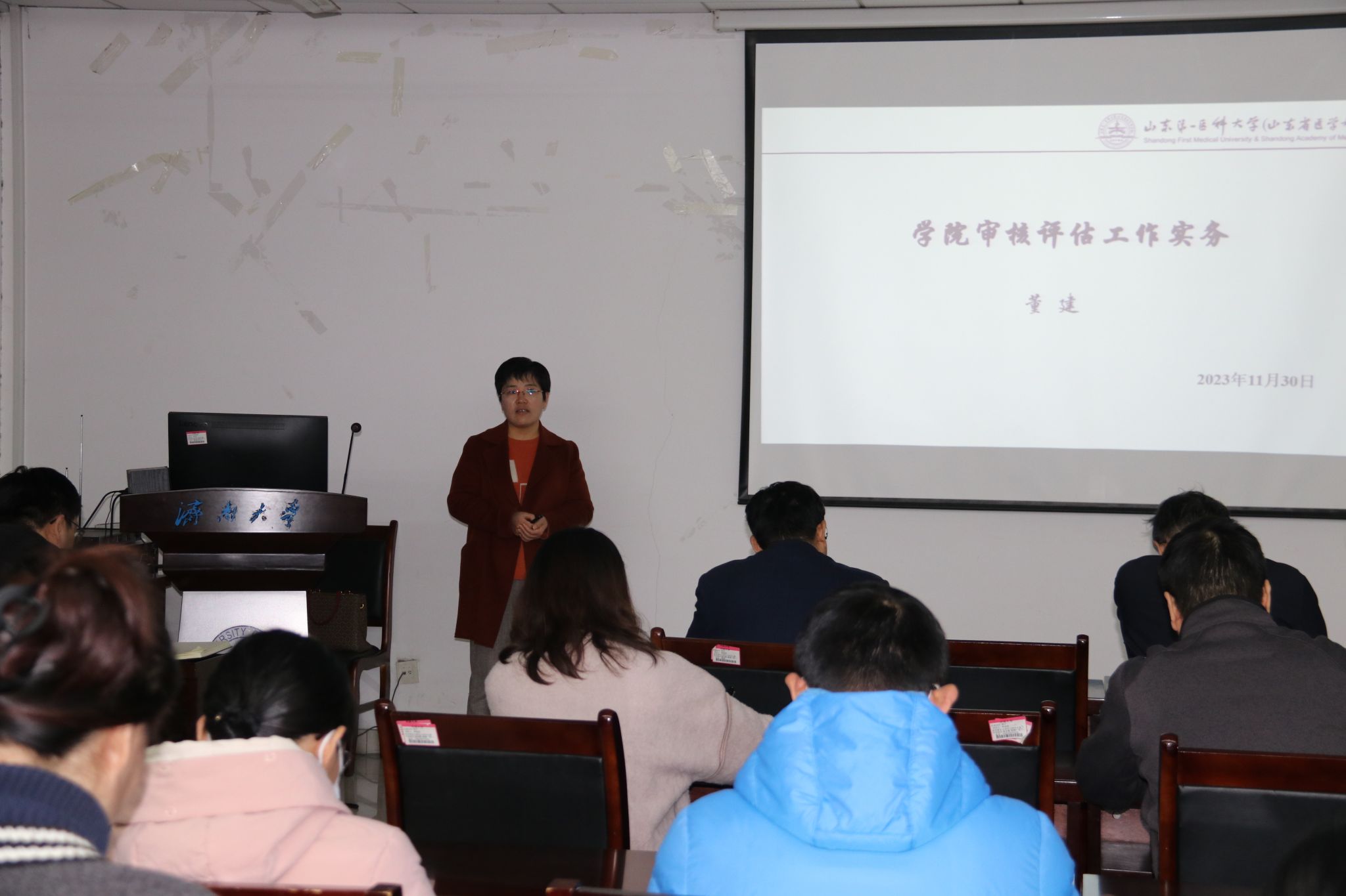 董建教授以《学院审核评估工作实务》为题,从“如何认识新一轮审核评估”“山一大审核评估情况”“学院审核评估工作重点”三个方面,深刻解释了新一轮审核评估的指导思想、基本原则,详细阐释了参加审核评估的目的以及学院应树立的观念,系统梳理了新一轮审核评估的完整工作流程,分享了山东第一医科大学参加新一轮审核评估的做法,从“学院的主要任务”、“专任教师的主要工作任务”、“学院和专业应树立的思想观念”、“学院高度重视的几项问题”等几方面详细说明了学院审核评估的工作重点。董教授的分享内容丰富、讲解深刻,为金年会官网进一步做好本科教育教学审核评估工作、推进学院本科教学的高质量发展提供了科学指导和有效的指引。