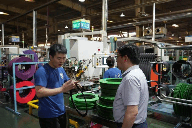 学院一行首站抵达山东华盛橡胶有限公司,技术研发中心副主任、山东宏盛科技有限公司总经理陈建军,技术研发中心部长徐凯,技术研发中心部长朱新静等热情接待。学院一行参观了企业研发中心,详细了解了公司在橡胶制品研发、新材料应用等领域的技术突破与创新成果。随后,双方深入一线生产车间,实地考察智能化生产线与精益化管理模式,直观感受产业升级对技术技能型人才的迫切需求。
