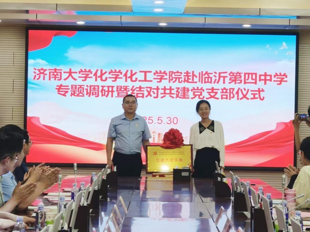 jinnian金年会化学党支部书记杨红晓与临沂第四中学西校区第二支部书记王雷共同为“党建共建基地”揭牌。两位书记分别表示将以支部共建为契机,把党建工作与教育教学、人才培养等中心工作深度融合,实现“党建引领方向,业务彰显成效”的良性循环。