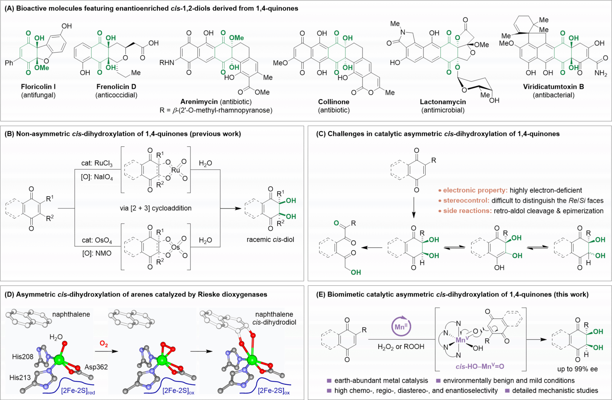 科学背景:重要的合成难题 手性顺式-1,2-二醇是许多具有重要生物活性的II型聚酮天然产物和临床药物分子中的关键结构单元(图1A),其立体化学精确性直接影响药理活性。在众多合成策略中,烯烃的不对称顺式双羟化反应是最直接、原子经济性最高的途径。经典的Sharpless不对称双羟化反应虽已广泛应用于富电子烯烃,但对于醌类化合物这类电子缺乏的烯烃,传统OsO4或RuO4催化体系难以实现有效的不对称诱导(图1B)。 具体而言,1,4-醌类底物面临四大挑战(图1C):(1)共轭二烯酮结构导致C=C双键反应活性低;(2)平面结构对称性强,手性识别困难;(3)α-C−H产物易发生差向异构化;(4)邻二醇产物对逆羟醛裂解敏感。此外,贵金属Os、Ru催化剂的使用也带来环境和可持续性方面的考量。