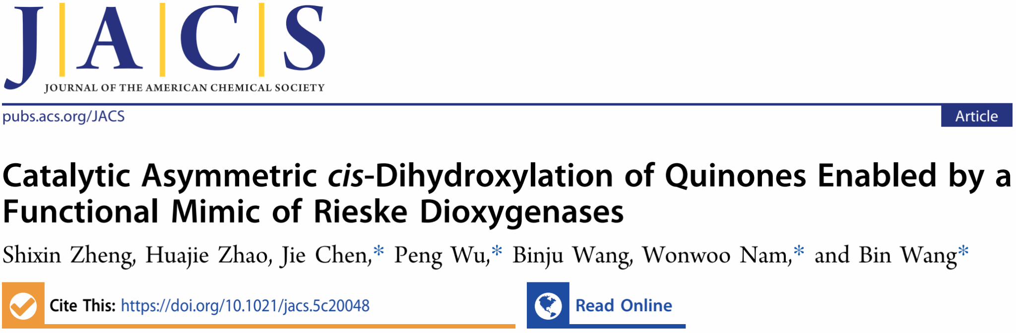 近日,金年会官网王斌教授课题组在化学领域权威期刊《美国化学会志》发表题为“Catalytic Asymmetric cis-Dihydroxylation of Quinones Enabled by a Functional Mimic of Rieske Dioxygenases”的研究论文(J. Am. Chem. Soc. 2026, https://doi.org/10.1021/jacs.5c20048)。该研究模仿自然界金属酶的催化机制,首次实现了非血红素锰配合物催化醌类化合物的不对称顺式双羟化反应,为手性邻二醇类化合物的高效合成提供了绿色新策略。